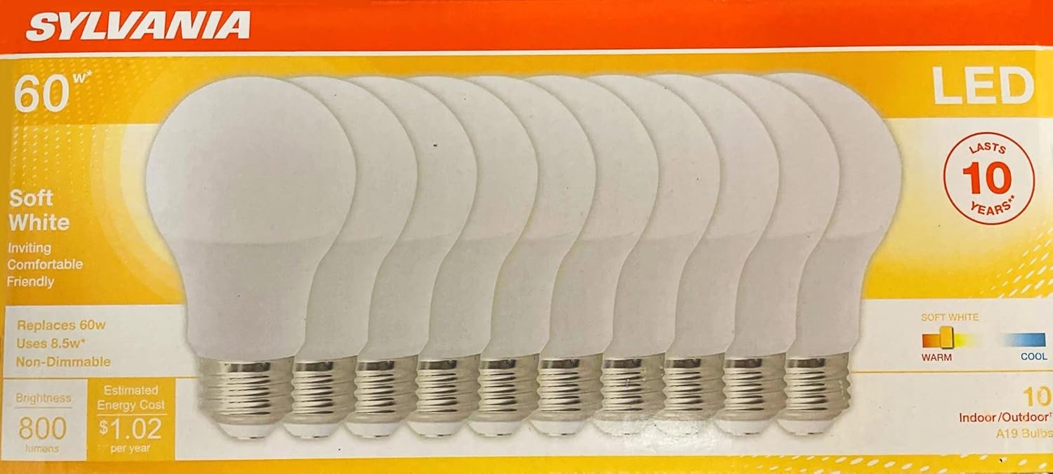 Sylvania LED A19 pack of 10 60 watt equivalent using only 8.5 watts 800 lumens 2700K Soft White Inviting Comfortable Friendly Light Indoor/Outdoor Medium base non-dimmable 10 LED bulbs