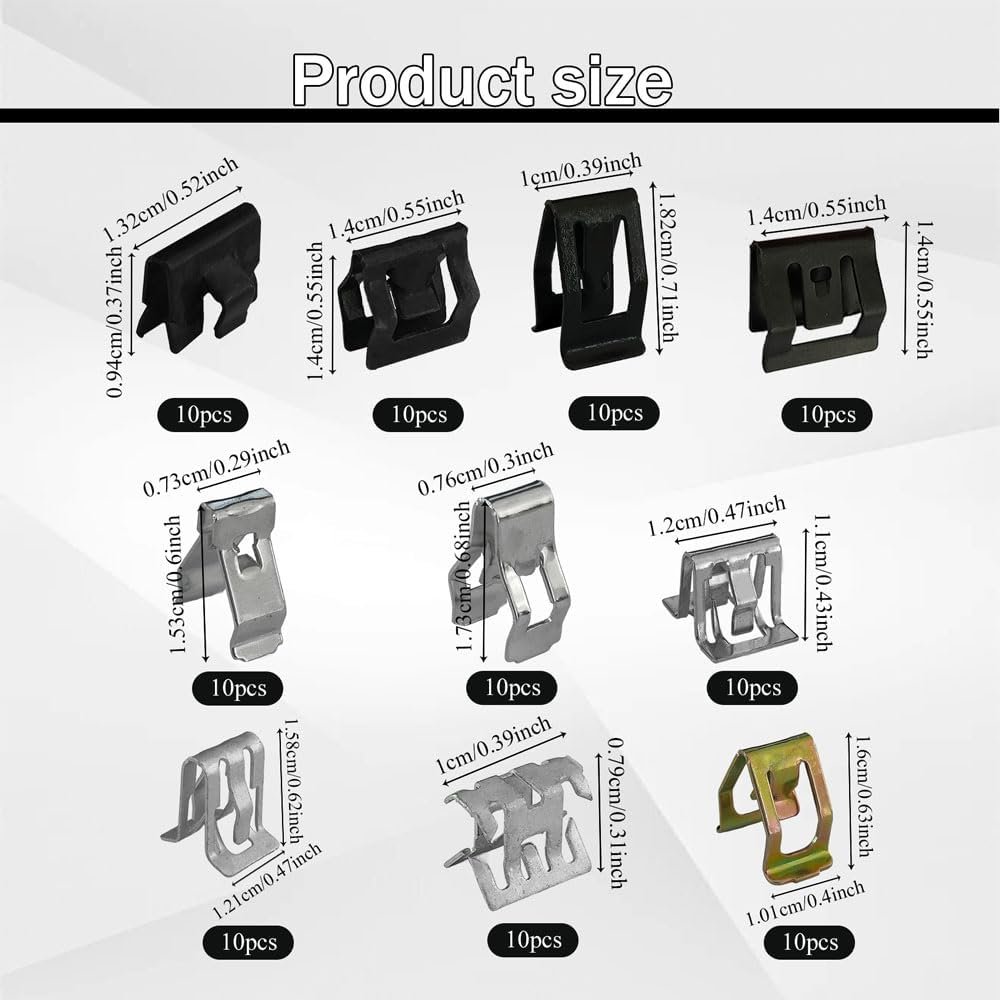 -You will get 100pcs 10 different types of metal trim panel spring clips, which will meet your daily demand.
