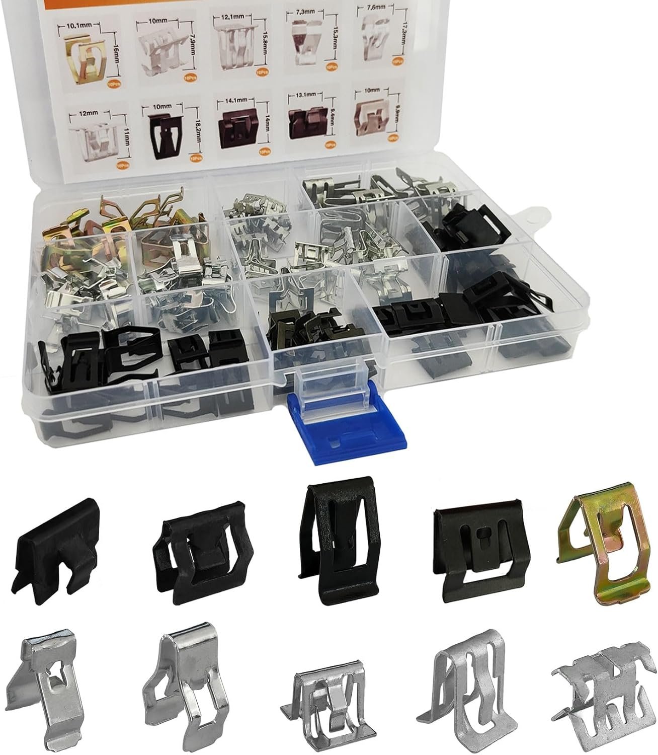 [Package includes] : You will receive 10 Sizes Auto Car U-Clip Metal Trim Panel Spring Clip, Height are 7.9mm 10mm 11mm 13.1mm 14.1mm 15.3mm 15.8mm 16mm 17.3mm 18.2mm. They are sorted in a plastic box,easy storage, avoiding mess and loss. Enough quantity for you to meet your daily needs