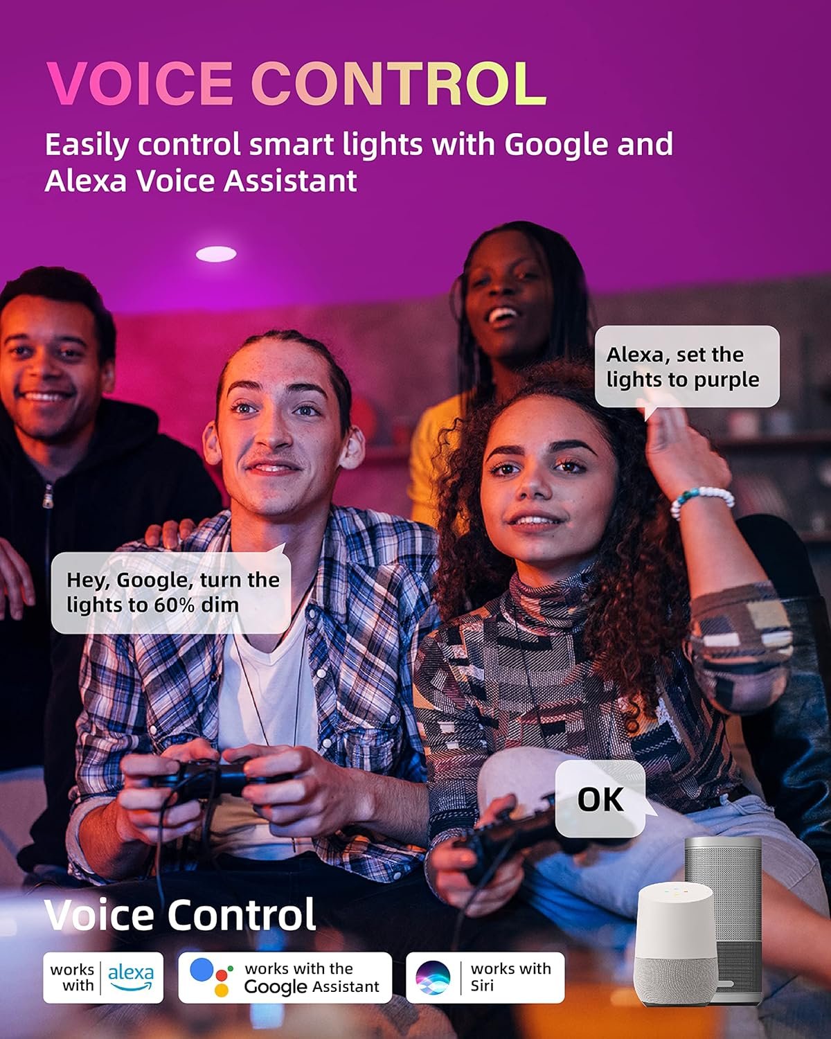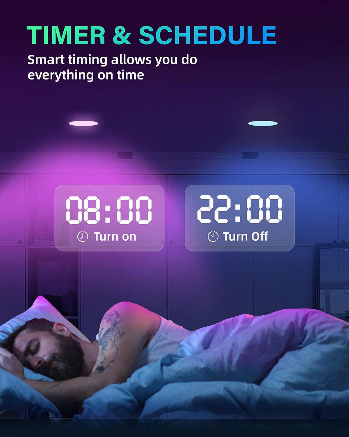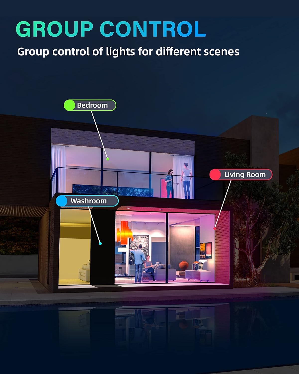 NOTE: When you turn off the wall switch, the light will return to its default white light. Please use the remote control, APP, voice assistants to control them.