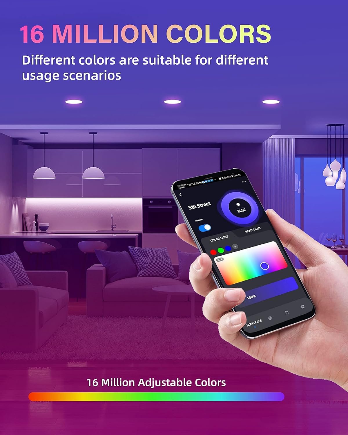 【Variety of Colors & Brightness】 The 4 inch smart recessed downlight supports warm white and cool white from 2700K to 6000K. Provide 16 million colors. 5%-100% brightness is adjustable. 8 scene modes, you can also DIY the scene modes you want.
