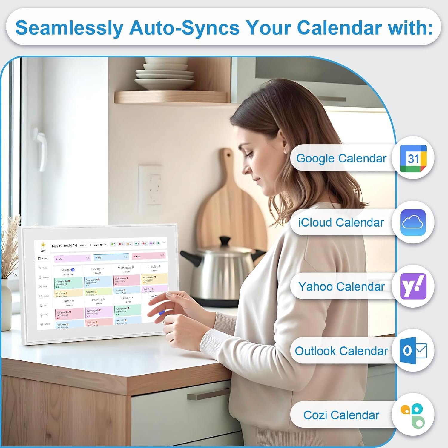 The interface is really simple to use. You can see your whole month, week, or just the day. Things are color-coded so it’s easy to tell what’s what. Adding events is quick, and you don’t have to mess around with complicated menus. Just tap and go. Even if you’re not super into tech, you’ll figure it out fast. The touch screen is nice and responsive. It doesn’t lag or freeze, and it reacts just how you’d expect when you swipe or tap. You can zoom in and scroll through dates easily. It feels smooth, kind of like using a tablet. As for the display, it looks great. The screen is clear and bright, and you can adjust the brightness depending or it will automatically do it. It also has a sleep timer. When you’re not using it for scheduling, it can show pictures, weather, and chores, which are a nice bonus!
