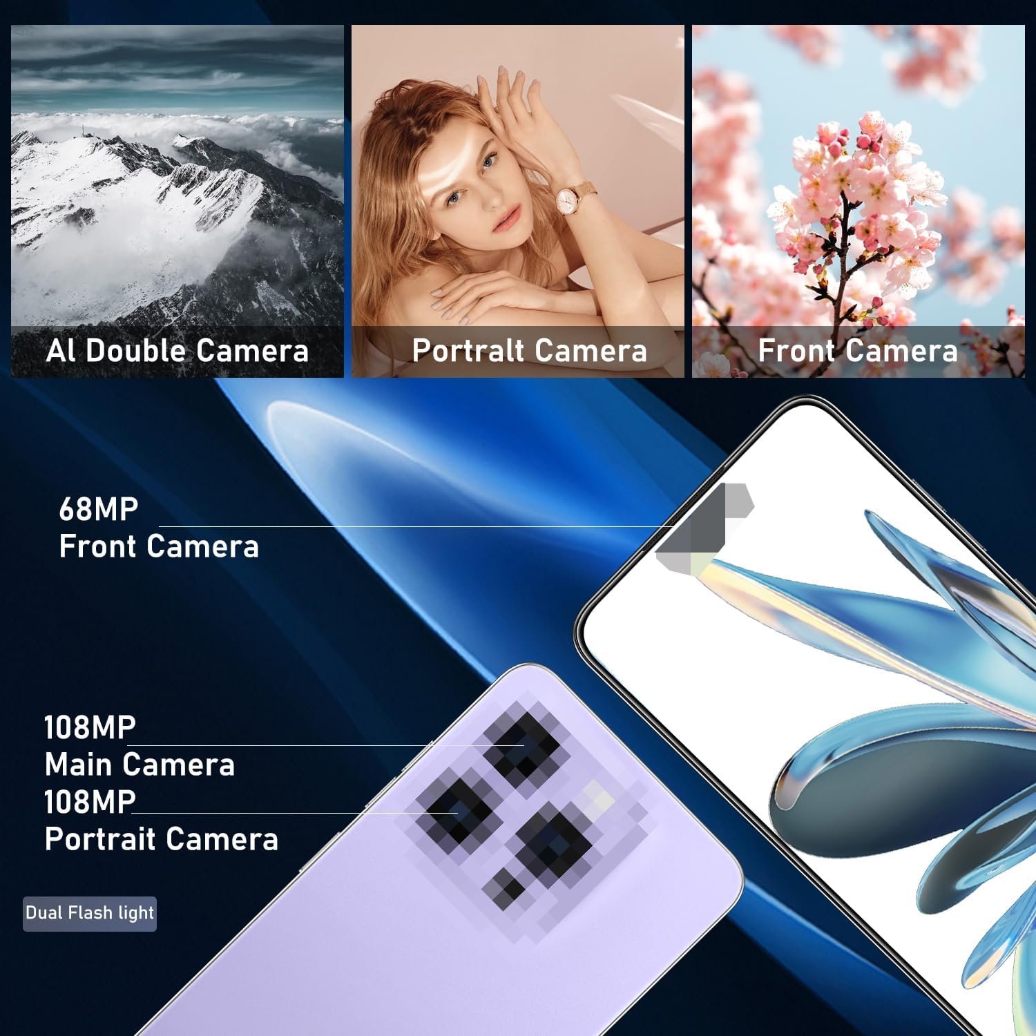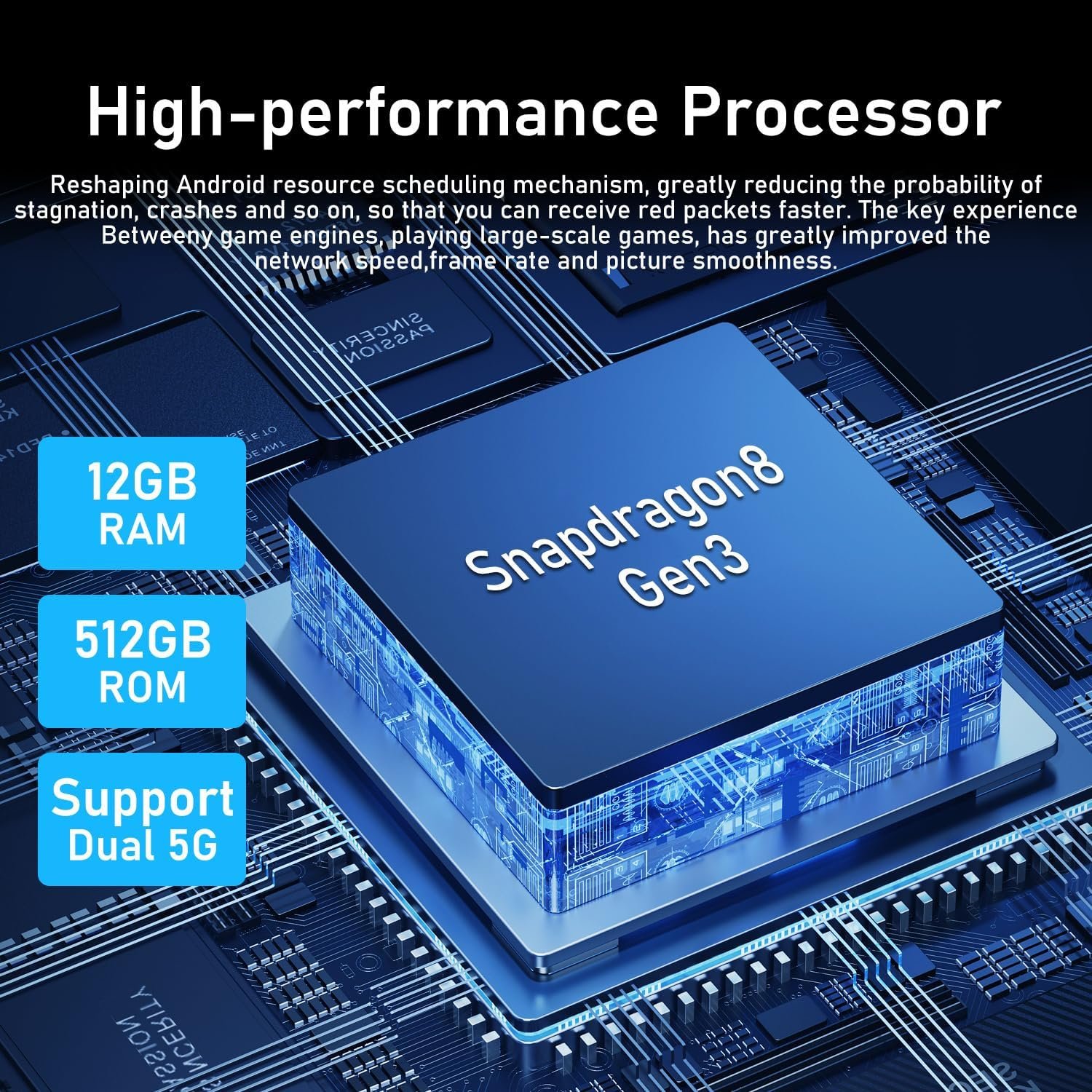 【108MP+68MP Camera & 12Core Processor】Snapdragon8 Gen3 12 Core CPU with 12GB+512GB 108MP main camera, paired with enhanced image processing algorithms, makes every photo exceptionally sharp and detailed, while still striking and lifelike. The cell phone is equipped with the powerful 12 CPU Core processor, which can dramatically improve the running speed, network, frame rate and picture smoothness, you will no more need to suffer from phone lag.