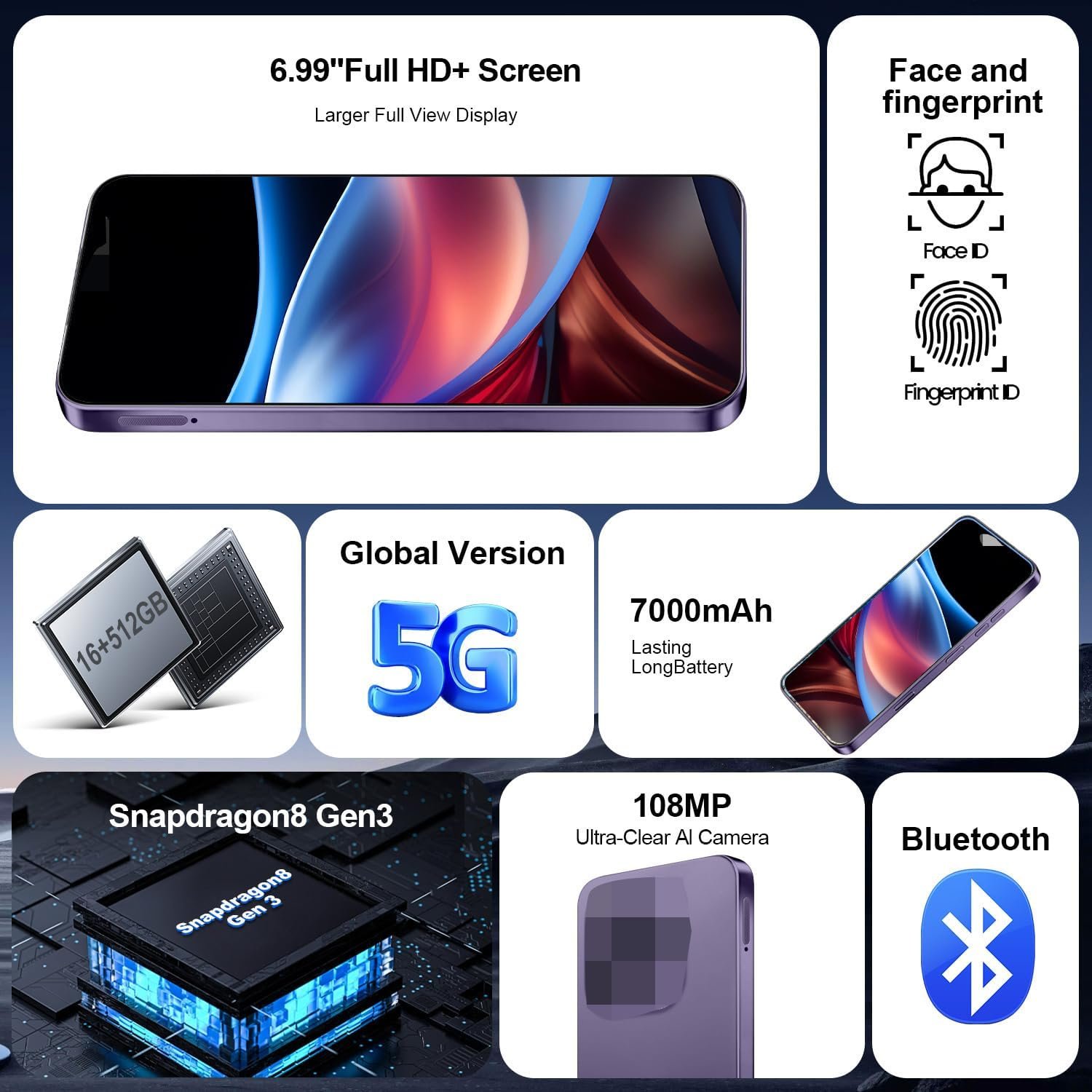 16PROMA X 5G Cell Phone,Smartphone Unlocked Cell Phone 16GB+512GB/6.99″ Display/68MP+108MP Camera/7000 mAh Battery Super Endurance, Dual SIM Card/Face Unlock/GPS (Deep Purple)