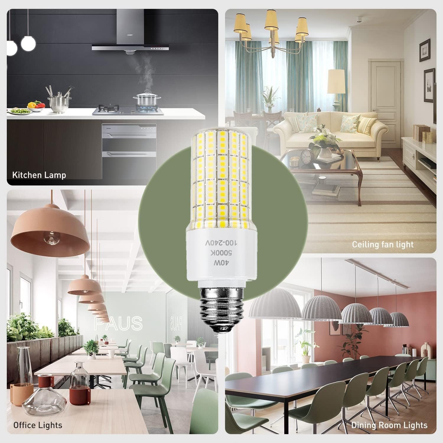 Power: 40W Lumen: 5000lm Input Voltage: AC100-240V Socket: Base E26/E27 Color : 5000 Kelvin, Daylight White Emitting Angle: 360 degrees