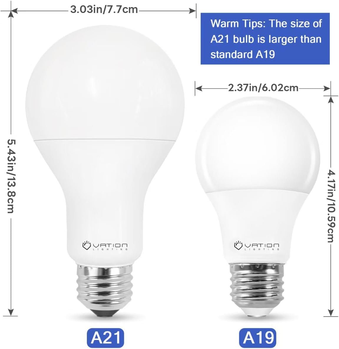 Energy Efficient: 150-200 Watt High Bright with 3000 Lumen Output, CRI Rating of 80 and a lifespan of 25,000 Hours. Replace your old incandescent A21 bulbs with these 23W A21 led bulbs, save over 85% on electricity bill of lighting for you