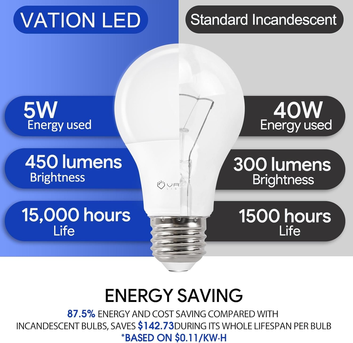 8 reviews for 24 Pack A19 LED Light Bulb, 40 Watt Equivalent, Efficient 5Watt, 450 Lumens, Daylight 5000K, E26 Medium Base, Non-Dimmable, ETL/UL Listed