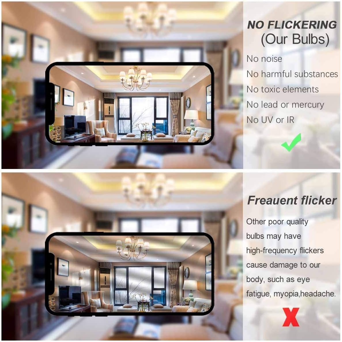 Flicker-free and Noise-Free : The latest advanced LED technology eliminates the flicker and noise from our bulbs, reducing the suffering of some health issues such as eyes exhaustion, migraine and so on, which could be caused by flickering lights and noise of poor quality bulbs