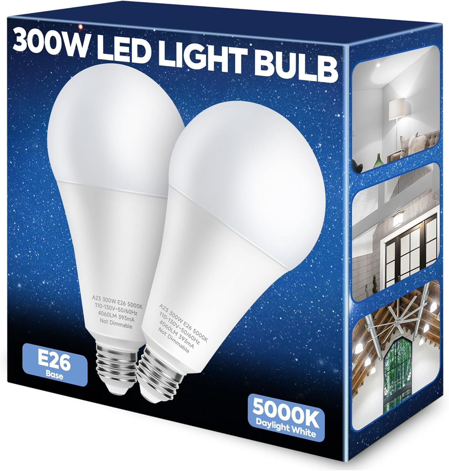 300W Equivalent LED Light Bulb, 4060LM Super Bright A23 LED Bulb, Daylight 5000K, 33W Energy Saving, E26 Medium Base, 120V for Garage, Warehouse, Shop, Supermarket, Non-Dimmable, 2 Pack