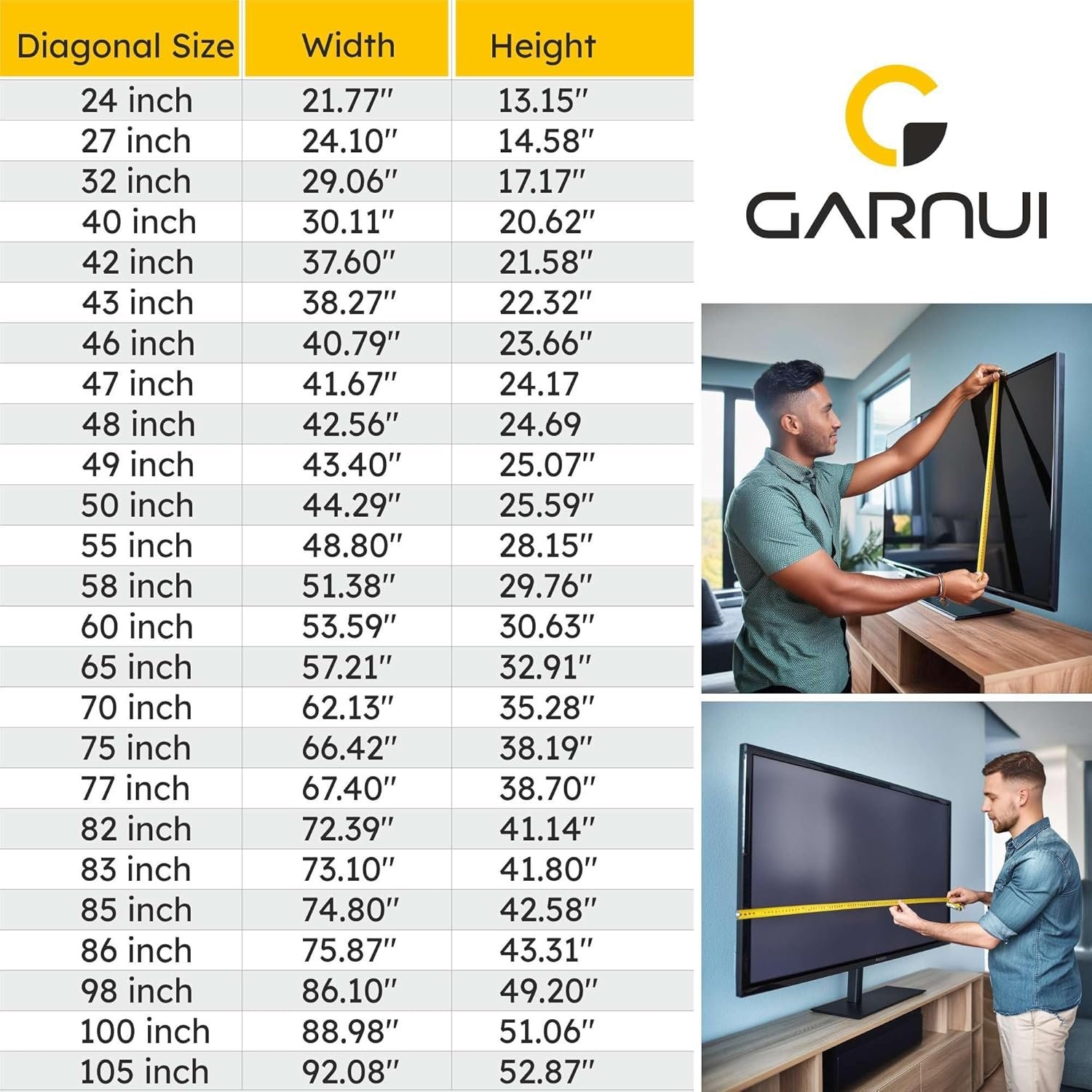 Universal Compatibility: Garnui tv protector fits all flat-screen TVs from 24 to 120 inches, Compatible with OLED TV, SMART TV, LED TV, Android TV, Fire TV, Bravia, Sony, Samsung, LG, Sharp, and many more. Also Compatible with OLED, QLED, LED, and LCD technologies.