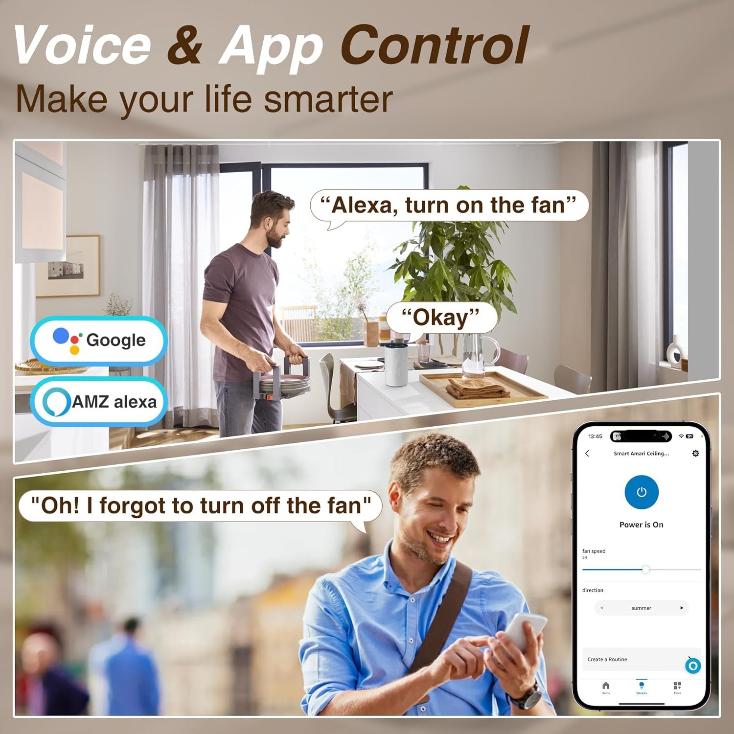 【Smart Voice/App/Remote】 Livory ceiling fan with smart control can be controlled by the app from anywhere. Simply say “Alexa/Hey Google, turn on the bedroom ceiling fan” with a smart voice command to easily control. Ceiling fans with lights remote control (handheld and wall-mounted), allowing for continued control even when WiFi is unavailable. Don’t worry about losing it