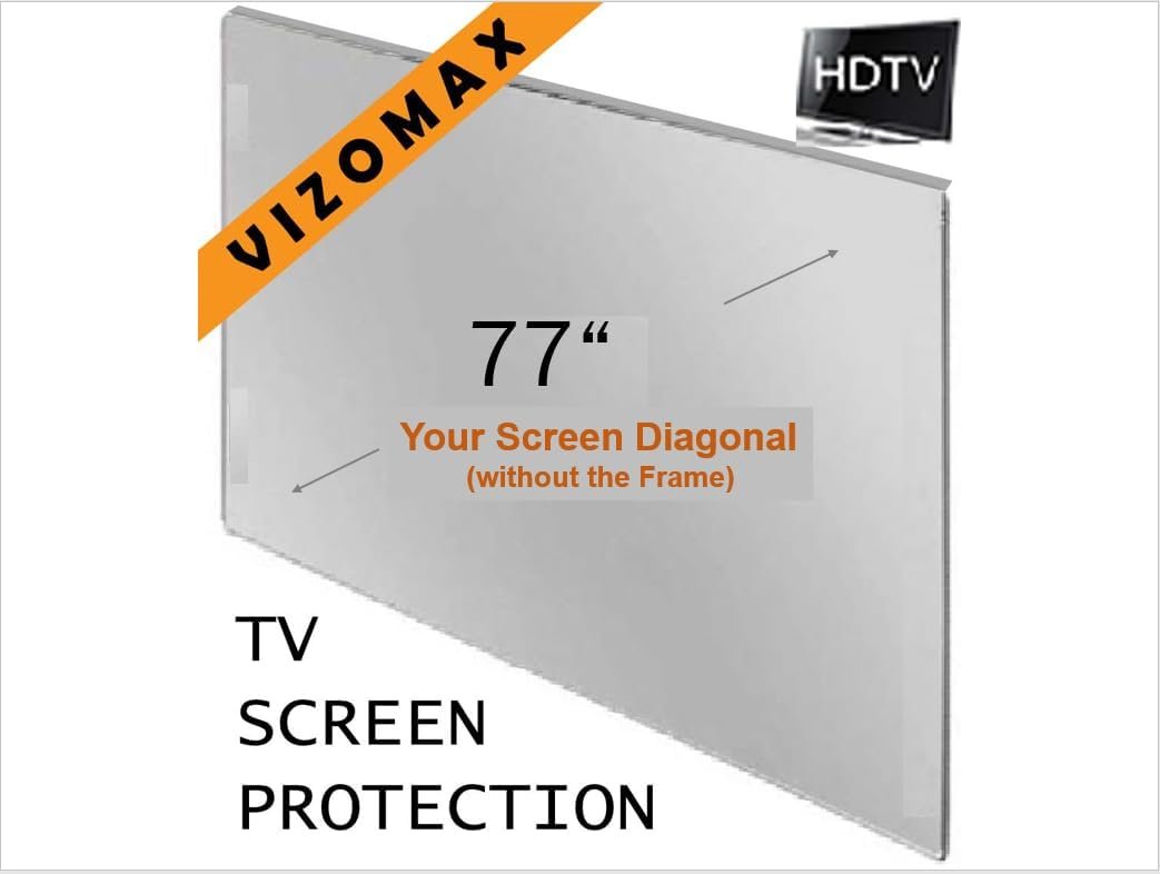 Vizomax TV screen protector is a transparent TV screen cover designed to prevent damage, scratches and fingerprints to the flat screen of a contemporary LED, LCD or Plasma TV. Vizomax is the leading TV screen protector brand in the US. 100% Clear: Proprietary optical-grade material optimized to maintain HDTV picture quality and ensures superior protection. Optical-grade technology; no material yellowing over time. Manufactured under rigorous quality standards. Polished edges and rounded corners ensure elegant appearance and complete user safety. Material treated to minimize flexing in front of the TV and ensure superior protection. Unbreakable: Heavy Duty! Advanced technology used to manufacture the transparent shield ensures that the high quality plastic is not only 100% clear but is also virtually unbreakable. Invisible: With its elegant proprietary design and unmatched optical clarity stands virtually invisible after installation. Easy Installation: Few minutes and no tools required. Just unpack and attach your new TV screen protector to your flat-screen TV. Enjoy in complete comfort like thousands across America. No covering of speakers and complete elegant appearance! Easy Snap On/Off detachment for Cleaning: Reclosable fasteners allow easy temporary detachment for cleaning. UV Protection: Filters out between 96% and 99% of the potentially harmful ultraviolet (UV) waves emitted by the TV screen Screen Ventilation: Vizomax TV screen protectors are designed to allow the screen to be cooled by natural air flow. DOES NOT work with touchscreens. Dry erase markers can be used on the TV protector. Protector covers the frame and is larger than the screen. Please measure the diagonal of your screen (without the frame) or look at your screen manufacture diagonal size in inches. Although, 100% transparent and clear, due to the filters in the lens the protector may be tinted and requires that the user increases the screen brightness by up to 15%.