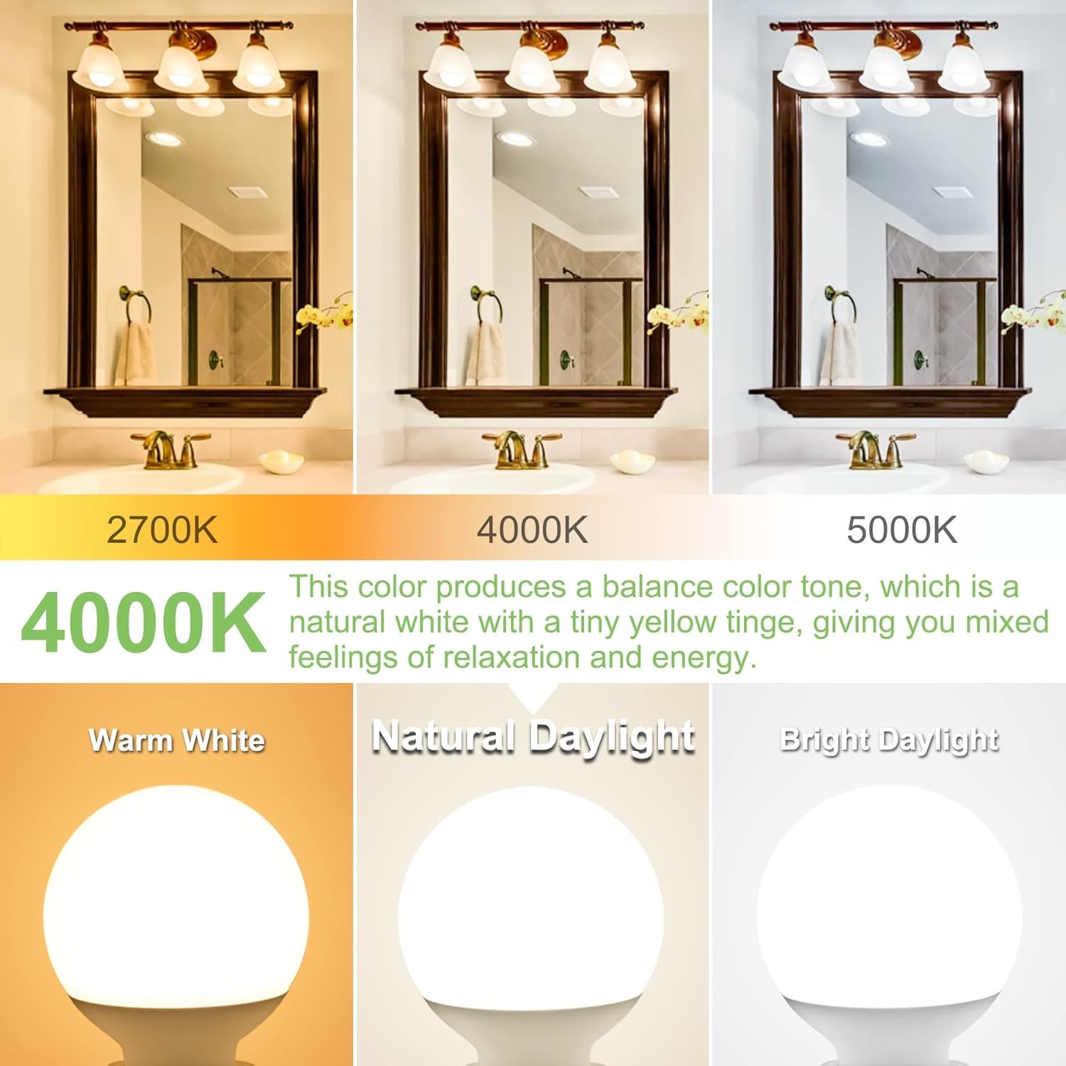 Vanity Light Bulbs 4000K Natural Daylight : 4000K natural daylight is the dividing line between 3000K warm light and 5000K Daylight white, which imitating natural light provides a lively and clean look, without appearing too blue or sterile. This natural light allows you to relax and stay awake. Suitable for light fixtures with E26 sockets like vanity mirror, dressing mirror. Appropriate for rooms like living rooms, bathrooms, kitchens, and other residential spaces.