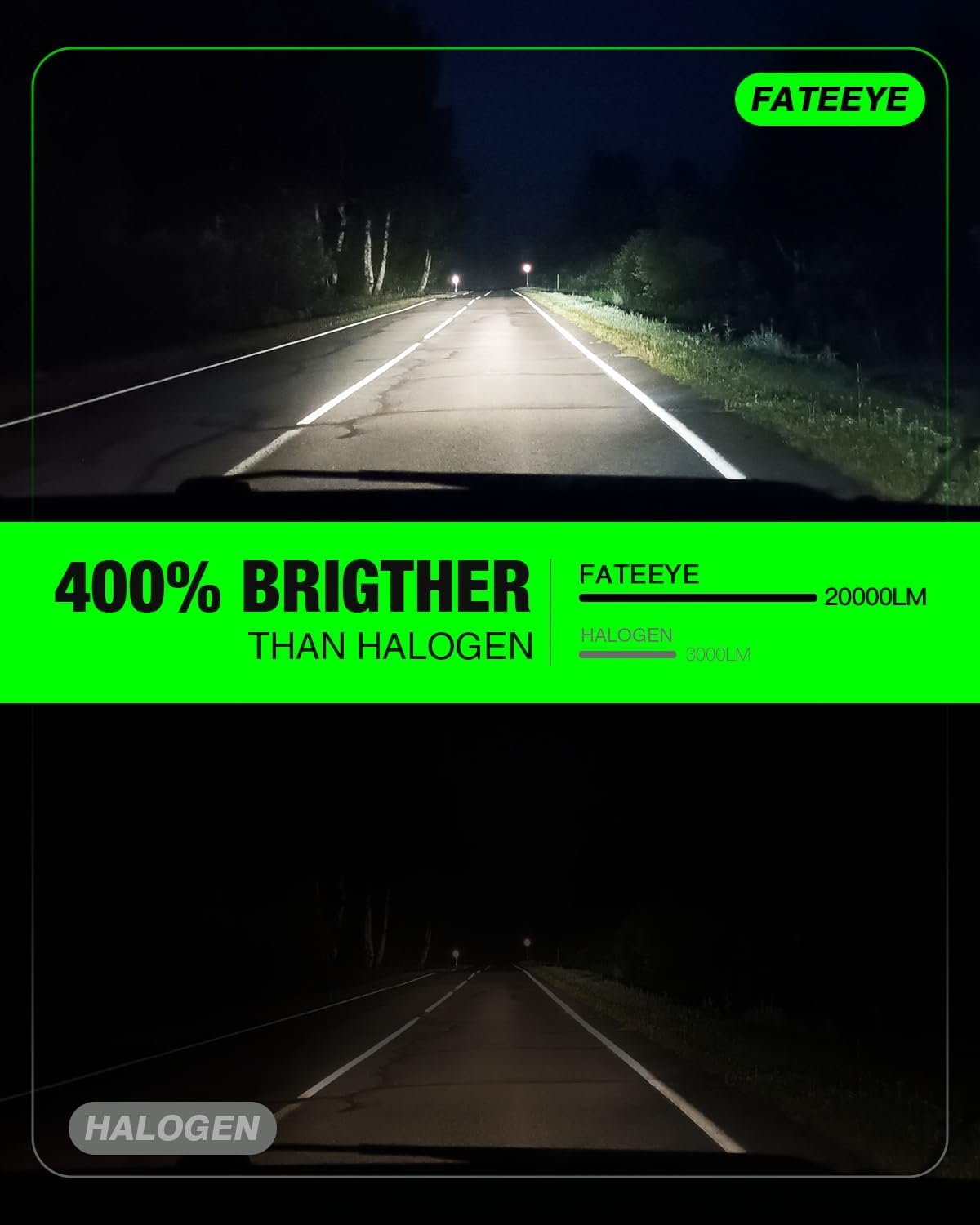 【Super Brightness】FateEye 9005 9006 bulb adopts the most advanced bulb chip in the market, the power can reach up to 100W, which can emit 20,000 lumens, 6500K cold white light.