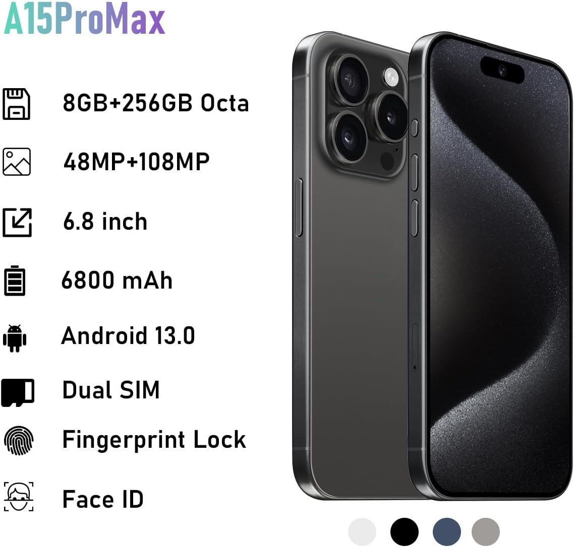 A15promax Unlocked 5G Phone 2024 Android 13 Cell Phones with 6.8″ FHD Screen Smartphones Dual SIM|Face ID|48MP+108MP|Snapdragon 8cen2|8GB+256GB|6800 mAh(Black)