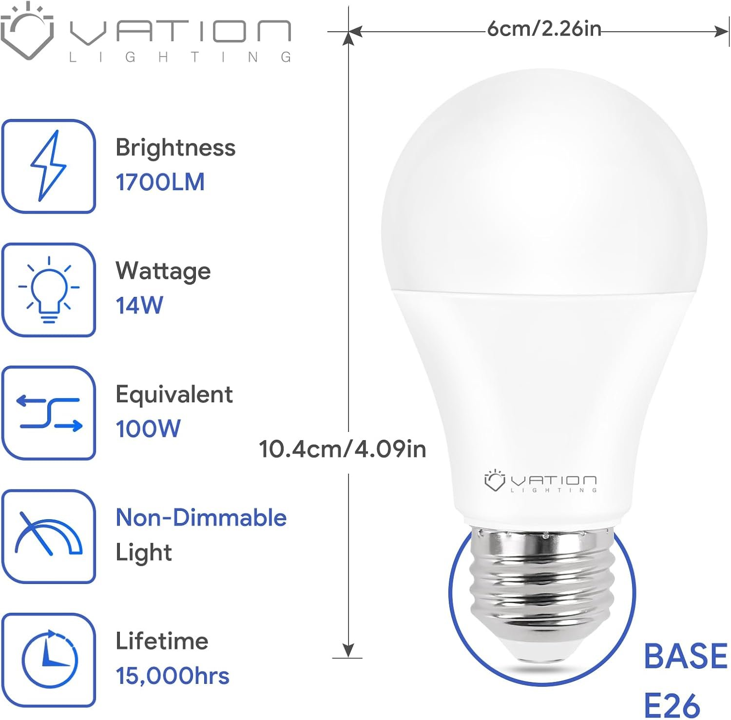 8 reviews for A19 LED Light Bulb Bright White Daylight 5000K, 100 Watt Equivalent, Efficient 14 Watt, 1700 Lumens, E26 Medium Base, Non-Dimmable, ETL/UL Listed, 6 Pack