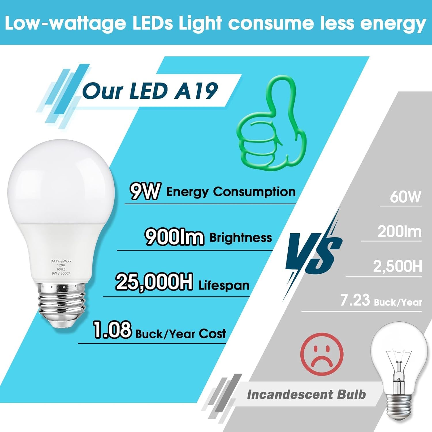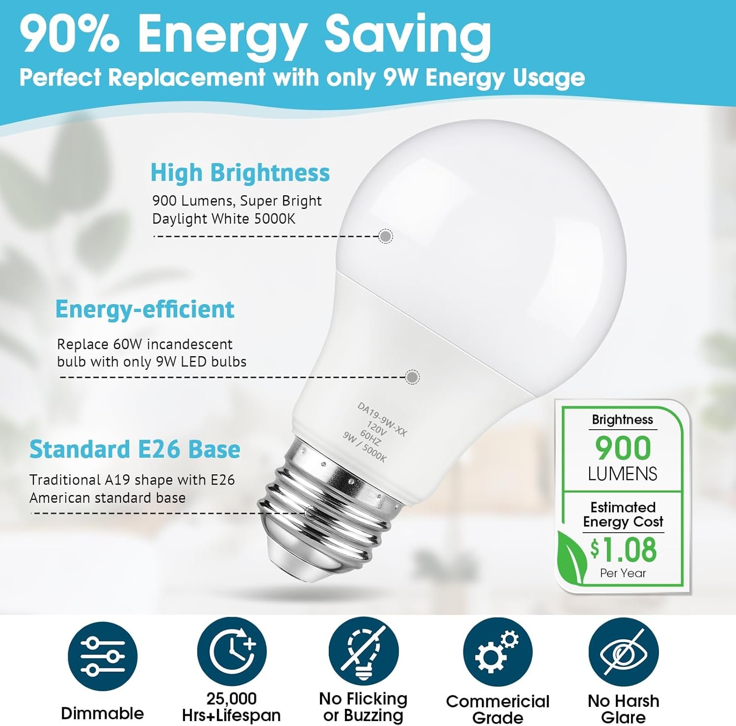8 reviews for A19 LED Light Bulb Dimmable, 60 Watt Equivalent LED Bulbs, Daylight White 5000K, 900 Lumen, E26 Base, 9W Bright White Light Bulb, 12-Pack