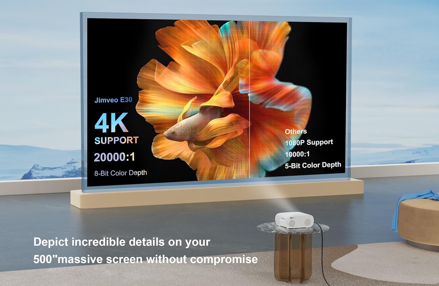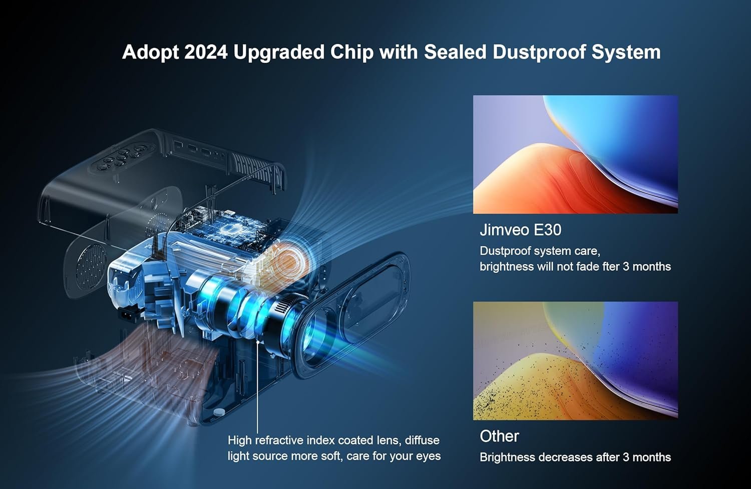 Sealed Engine & Long-term Support: E30 Projector 4k with full-sealed optical system avoids dust pollution on optical components and helps prolong the lifespan of the projectors.We offers 24/7 service, 1 Year Replacement, 3 Year repair & lifelong support