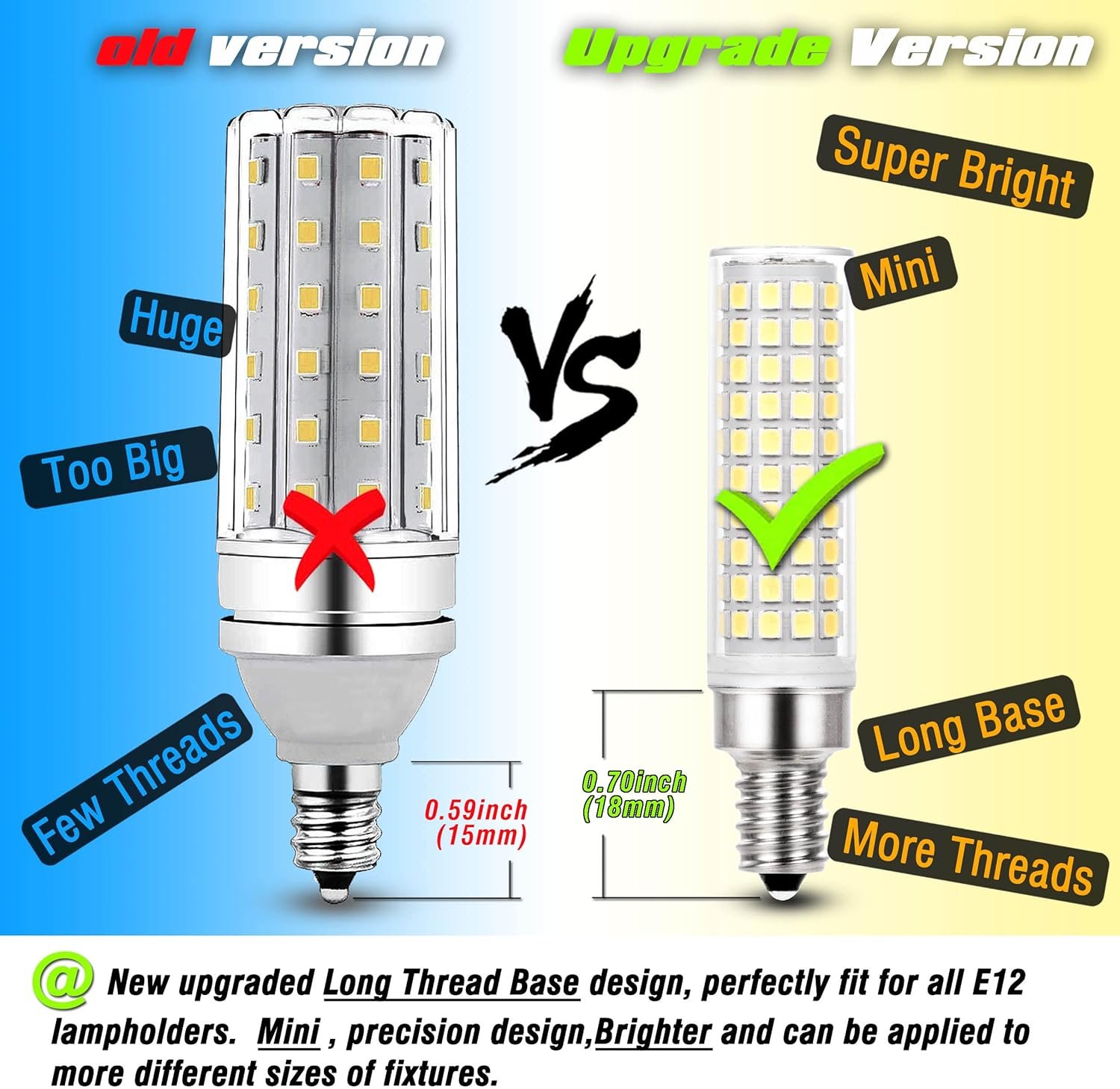 New Upgraded Long Thread Base: Perfectly fit for all different e12 base fixtures, you no need worry the base issue this time. E12 candelabra small base screw socket means the base diameter is 12mm, not e11, e17, e26