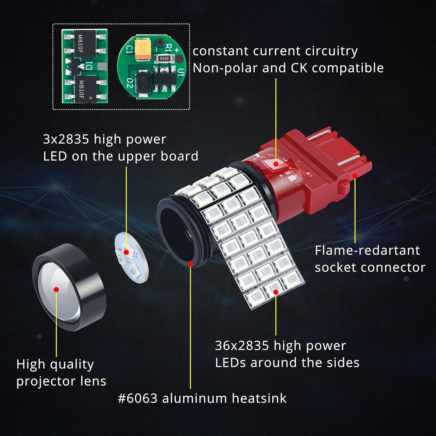 (Set of 2) Important Fitment Guide: Please make sure the OEM bulb’s part number matches below cross reference number before purchasing and make sure to purchase the correct items, if purchased wrongly, it won’t fit. LED Chips: Each 3156/3157 LED red bulb is equipped with 39 pieces high quality, high power with high performance 2835 SMDs, 360° full angle illumination with projector lens.