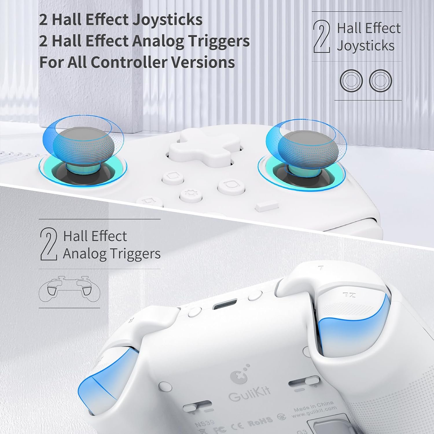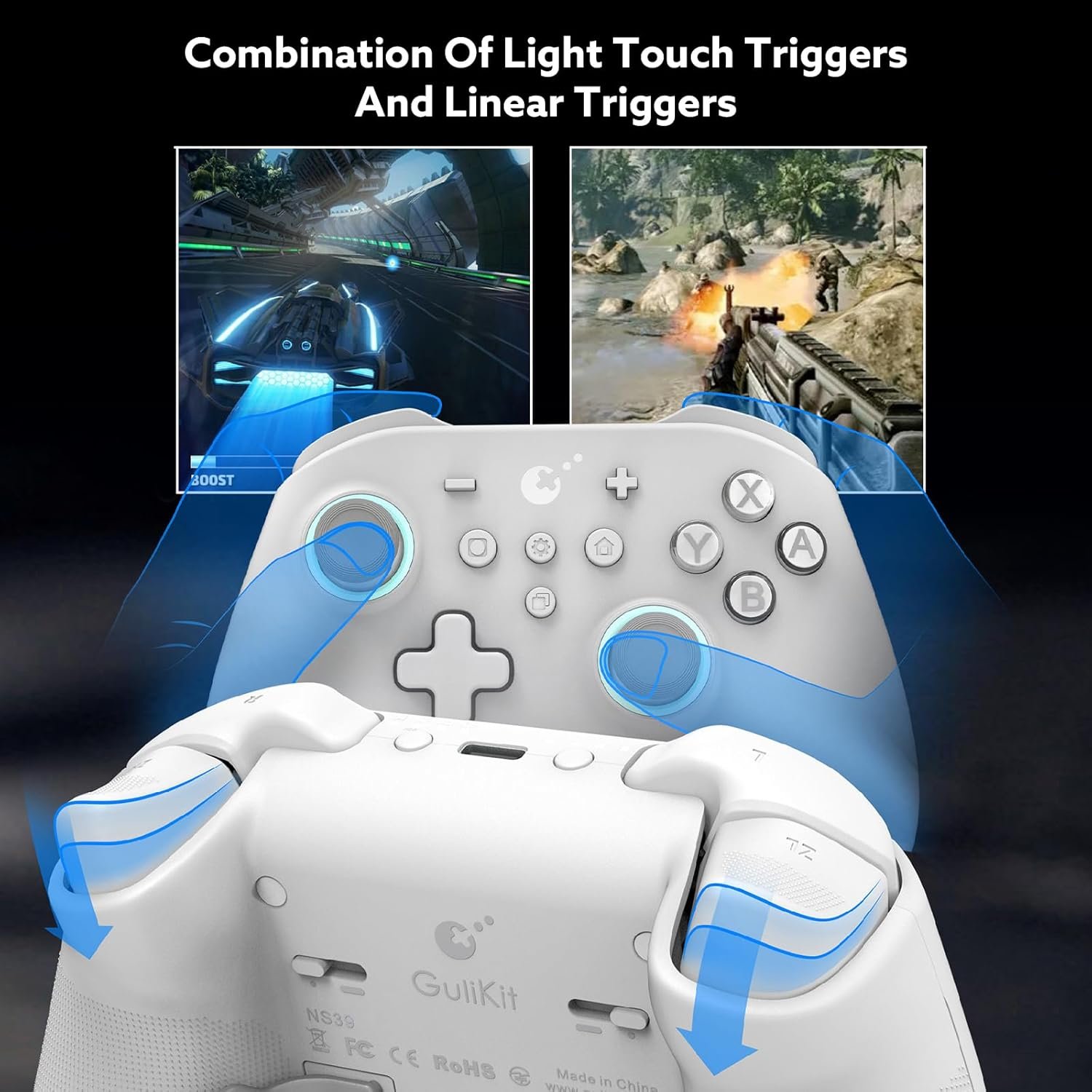 【Hall Effect Triggers】The combination of light touch triggers and linear triggers are Setting by sliding the trigger locks On The Back, Enabling An Ultra-Fast Rate Of Fire For Shooting Games Or Analog Triggers Enabling Pressure-Sensitive Action For Car Racing Games.
