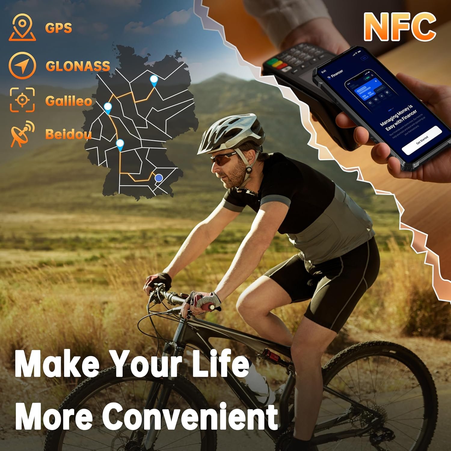 【Multi-functional Toolkit】This rugged mobile phone supports NFC and Google Pay for seamless data transfer and contactless payments. It includes dual SIM card slots or one slot for expanding storage (ROM) up to 1TB. GPS+GLONASS+Beidou+Galileo support ensures accurate navigation, while facial and rear fingerprint recognition provides easy unlocking